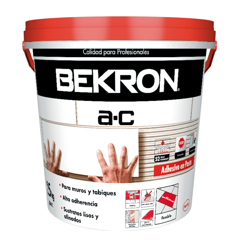 BEKRON AC PASTA, es simple de aplicar y tiene un fuerte agarre inicial. Es impermeable y una vez seco absorbe tensiones moderadas del sustrato.