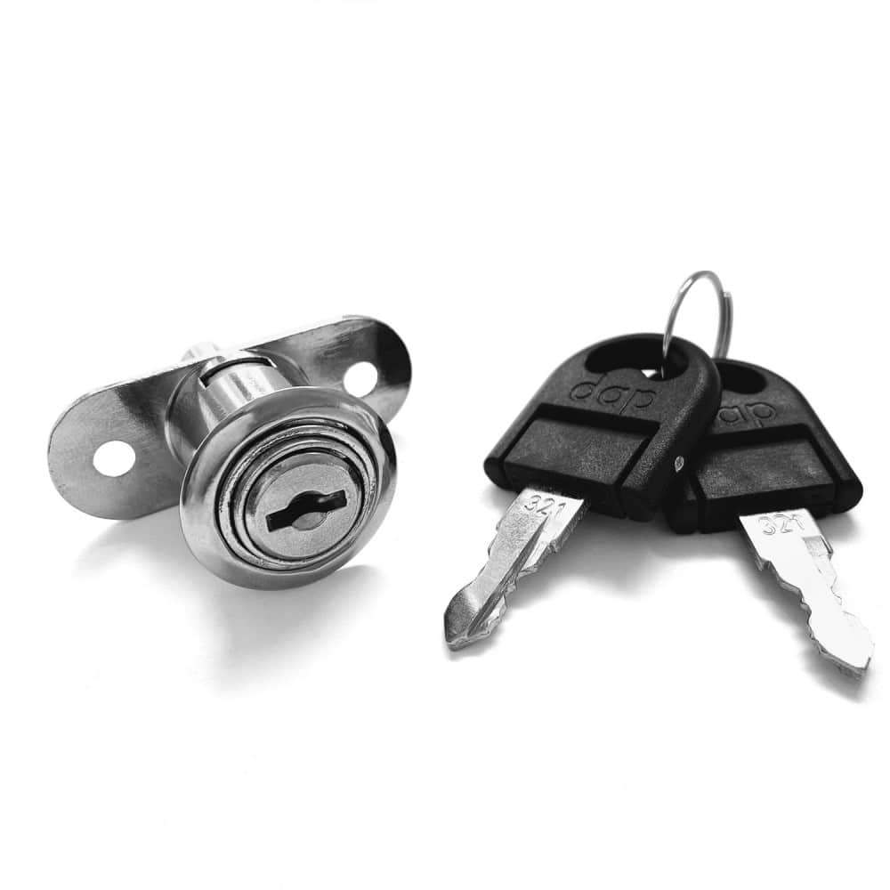Cerradura de botón con alargue modelo 780 y alargue de 10 mm. Acabado cromo brillante. Diámetro exterior de 19 mm, largo del seguro de 50 mm. Incluye 2 llaves.